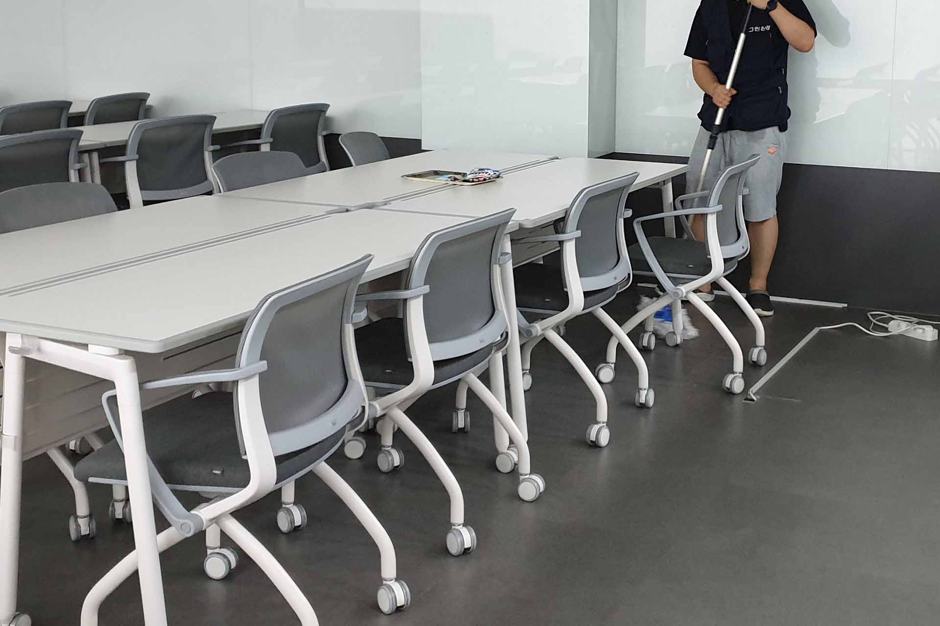 회의실 책상 위의 먼지는 물론 의자 정리와 책상 위의 비품들 정리로 깔끔한 사무실로 만들어 드립니다.